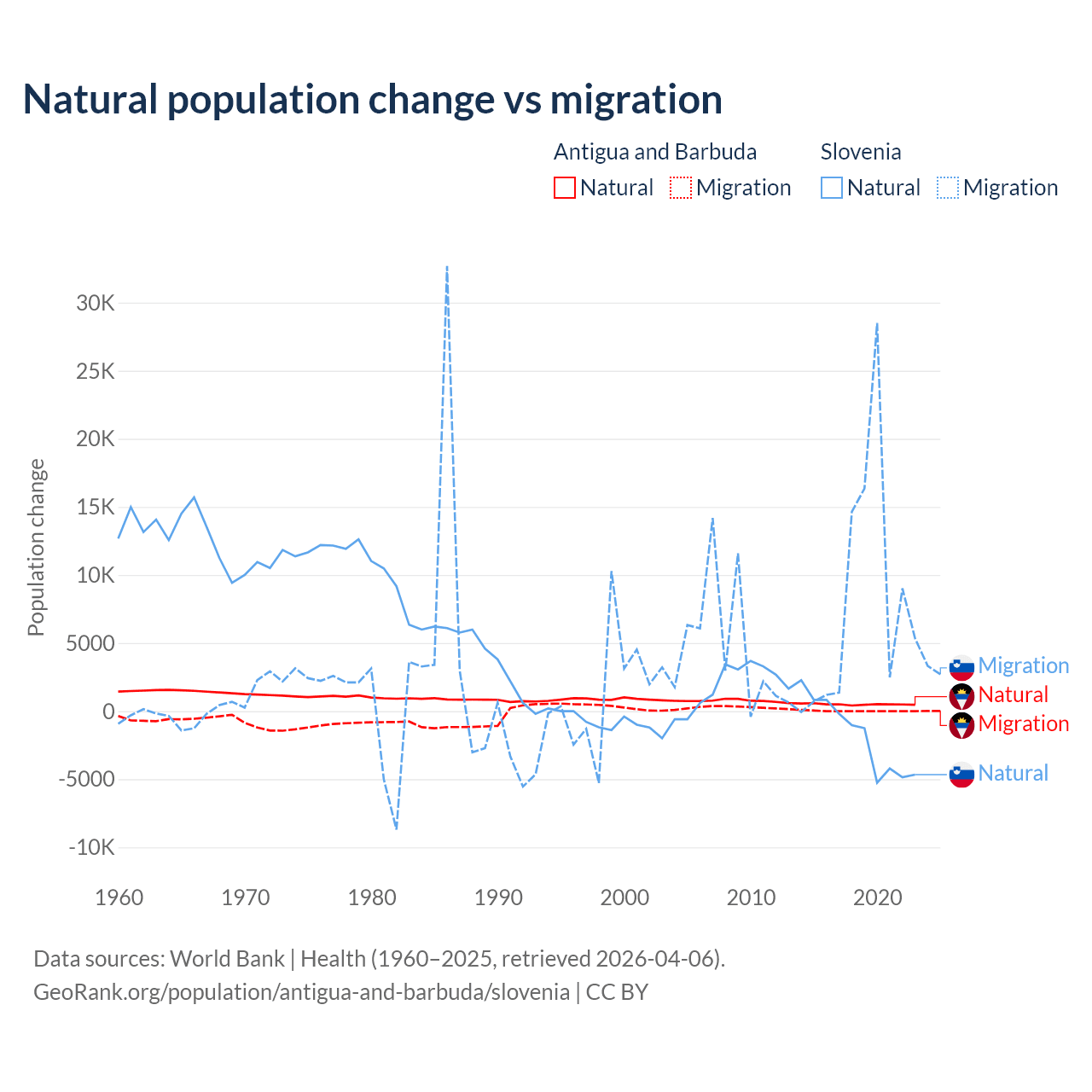 Over the last 10 years, 97.2% of the population change in Antigua and Barbuda is from natural causes (a gain of 4,971 people) and 2.76% is from migration (a gain of 141 people). In Slovenia 18.1% is from natural causes (a loss of 17,573 people) and 81.9% is from migration (a gain of 79,532 people).