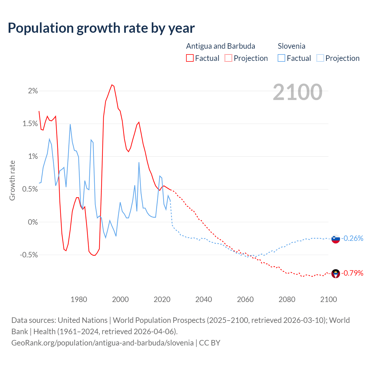 - For the last 10 years, Antigua and Barbuda has had an average growth rate of +0.57% per year vs +0.29% in Slovenia.