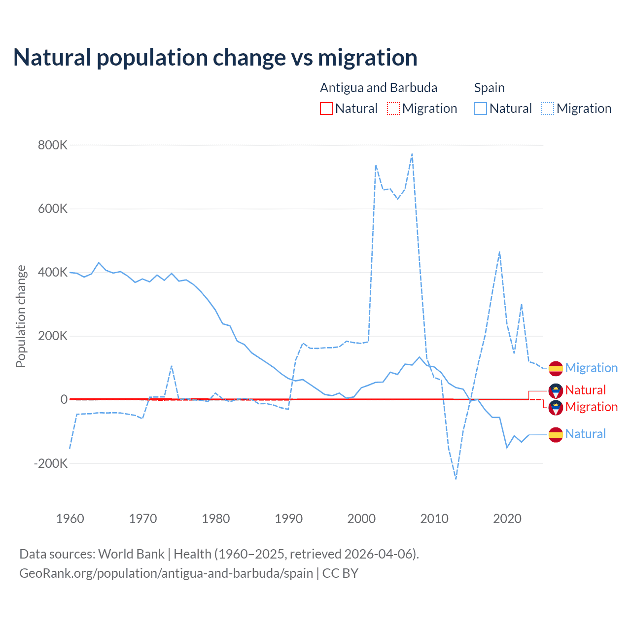 Over the last 10 years, 97.2% of the population change in Antigua and Barbuda is from natural causes (a gain of 4,971 people) and 2.76% is from migration (a gain of 141 people). In Spain 25.8% is from natural causes (a loss of 627,829 people) and 74.2% is from migration (a gain of 1,810,127 people).