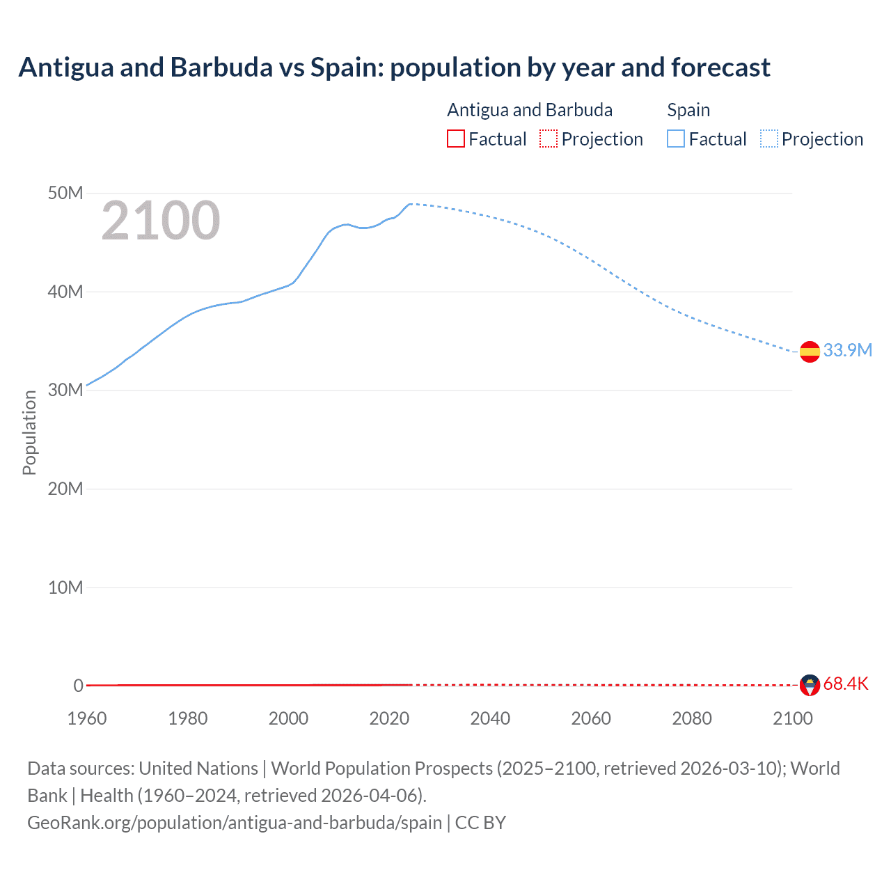 Antigua and Barbuda vs Spain: population by year and forecast