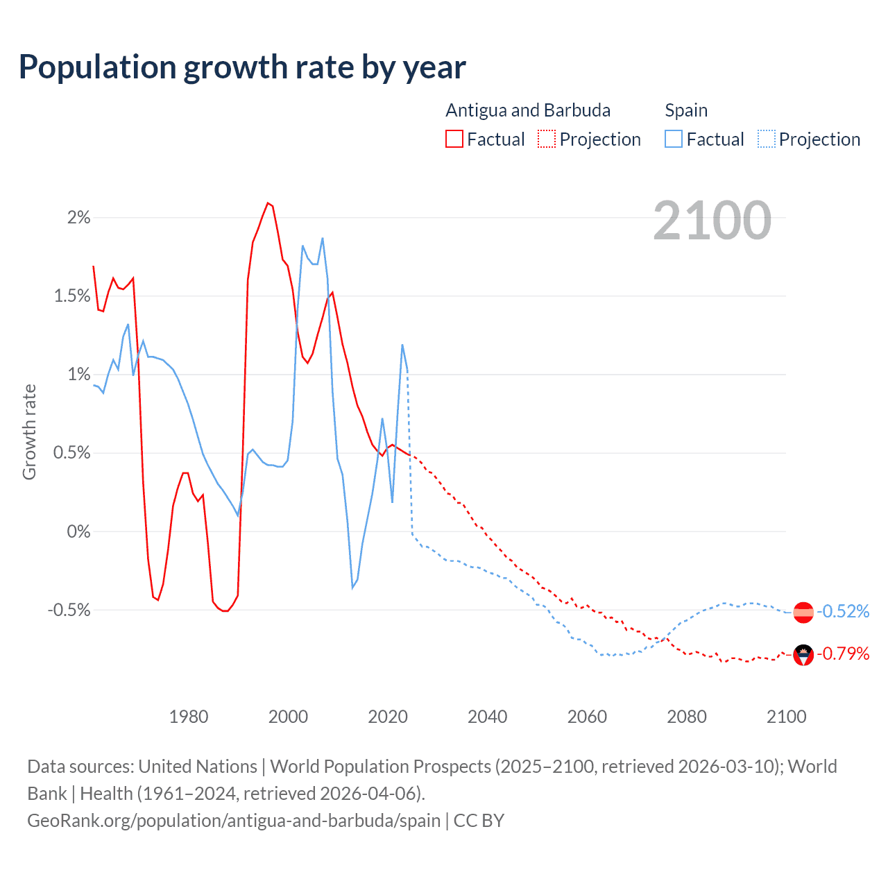 - For the last 10 years, Antigua and Barbuda has had an average growth rate of +0.57% per year vs +0.43% in Spain.
