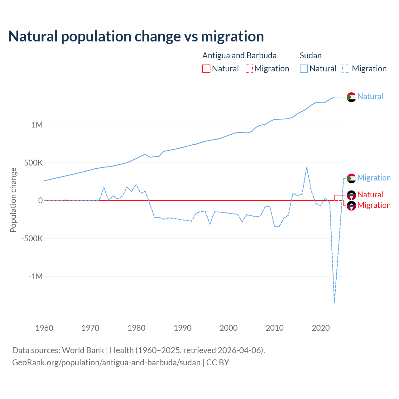 Over the last 10 years, 97.2% of the population change in Antigua and Barbuda is from natural causes (a gain of 4,971 people) and 2.76% is from migration (a gain of 141 people). In Sudan 95.1% is from natural causes (a gain of 12,459,977 people) and 4.88% is from migration (a loss of 639,596 people).