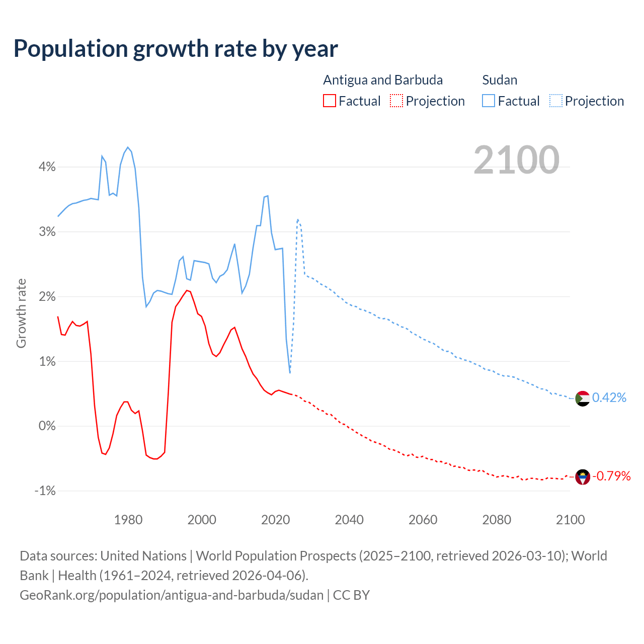 - For the last 10 years, Antigua and Barbuda has had an average growth rate of +0.57% per year vs +2.67% in Sudan.