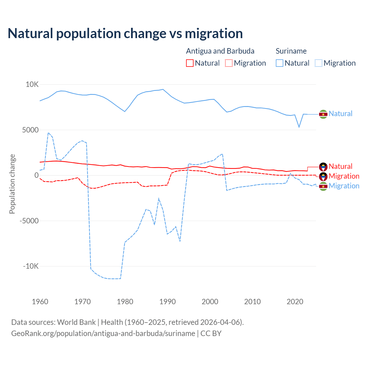 Over the last 10 years, 97.2% of the population change in Antigua and Barbuda is from natural causes (a gain of 4,971 people) and 2.76% is from migration (a gain of 141 people). In Suriname 90.3% is from natural causes (a gain of 66,709 people) and 9.72% is from migration (a loss of 7,185 people).