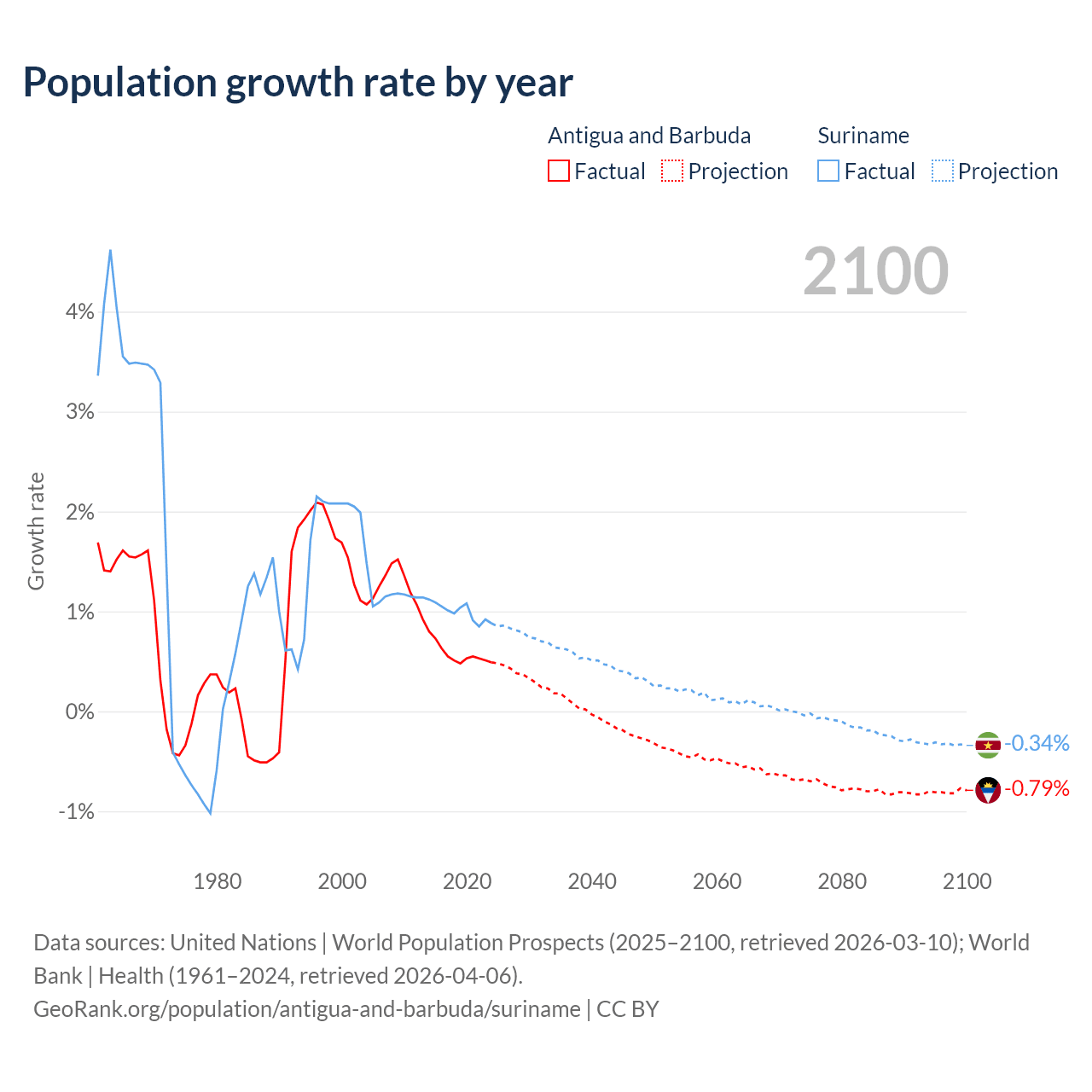 - For the last 10 years, Antigua and Barbuda has had an average growth rate of +0.57% per year vs +0.99% in Suriname.