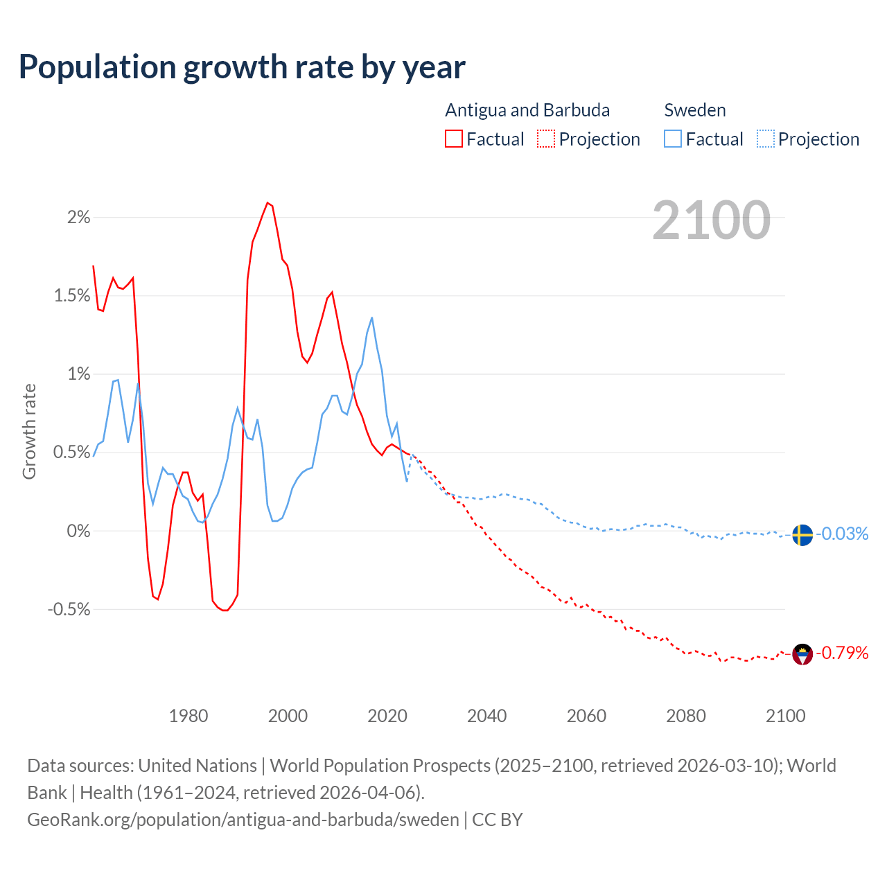 - For the last 10 years, Antigua and Barbuda has had an average growth rate of +0.57% per year vs +0.88% in Sweden.