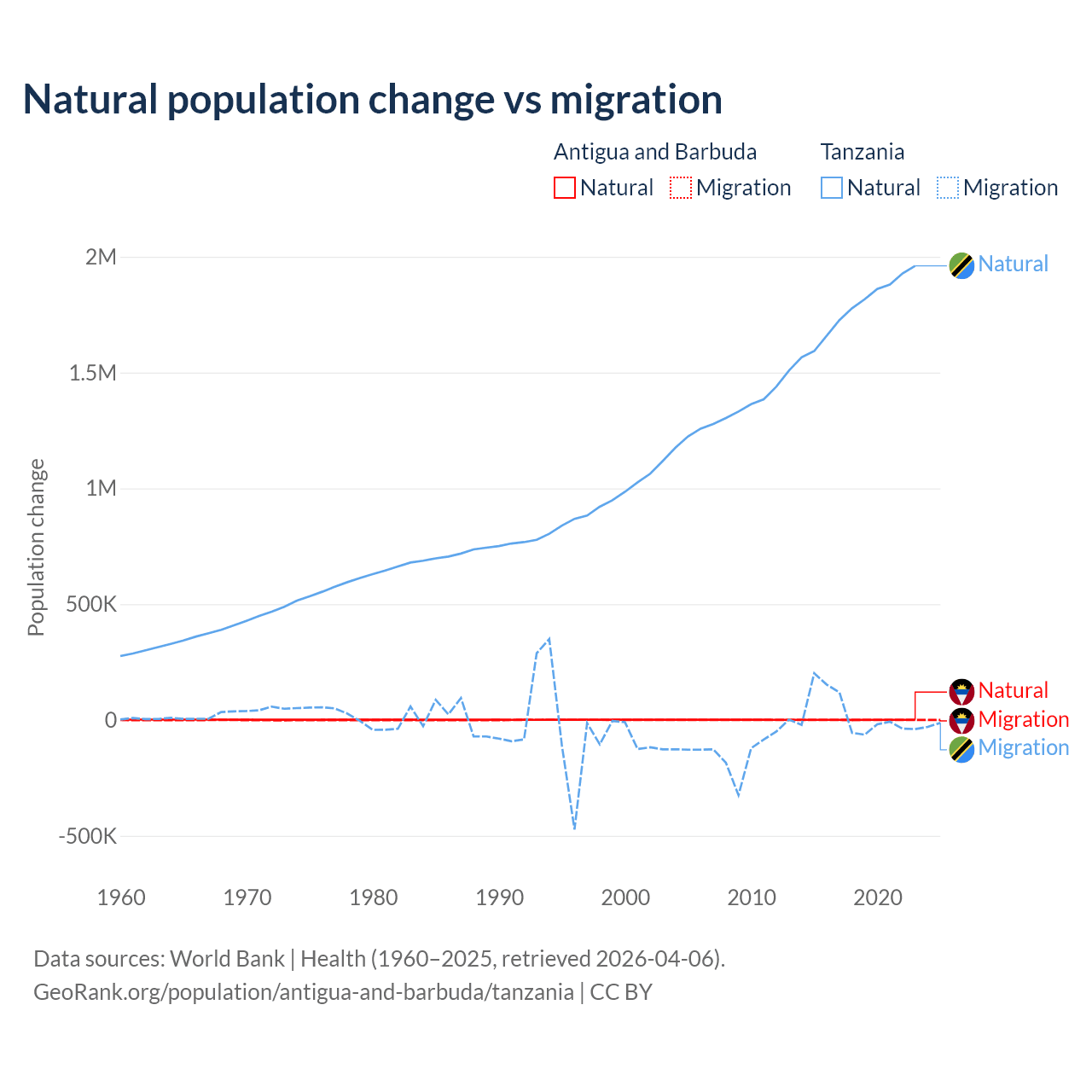 Over the last 10 years, 97.2% of the population change in Antigua and Barbuda is from natural causes (a gain of 4,971 people) and 2.76% is from migration (a gain of 141 people). In Tanzania 98.7% is from natural causes (a gain of 17,769,541 people) and 1.27% is from migration (a gain of 229,466 people).