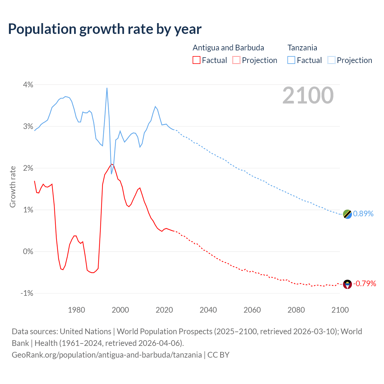 - For the last 10 years, Antigua and Barbuda has had an average growth rate of +0.57% per year vs +3.13% in Tanzania.