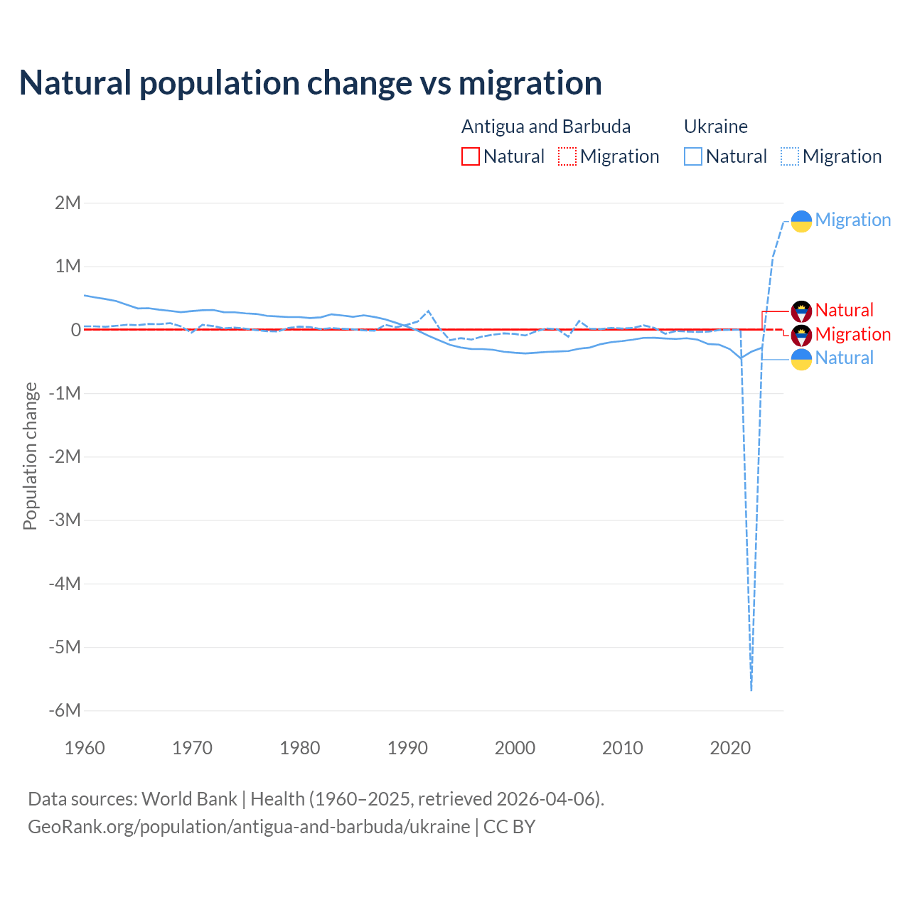 Over the last 10 years, 97.2% of the population change in Antigua and Barbuda is from natural causes (a gain of 4,971 people) and 2.76% is from migration (a gain of 141 people). In Ukraine 28.2% is from natural causes (a loss of 2,435,153 people) and 71.8% is from migration (a loss of 6,198,995 people).