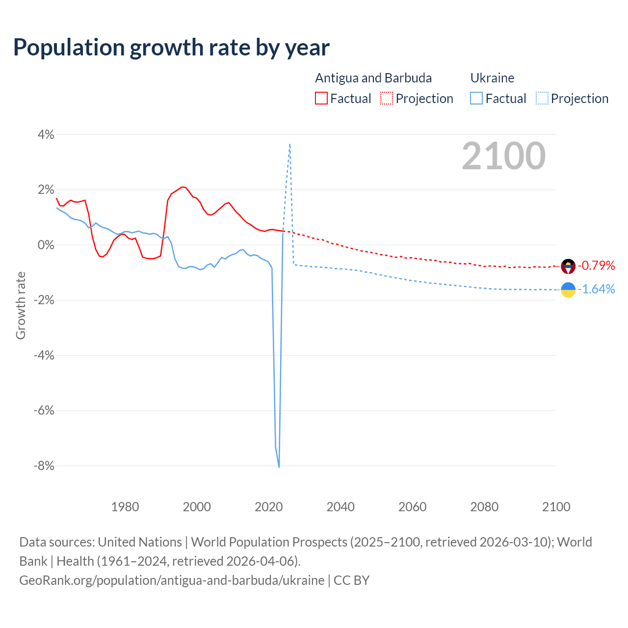 - For the last 10 years, Antigua and Barbuda has had an average growth rate of +0.57% per year vs -1.74% in Ukraine.