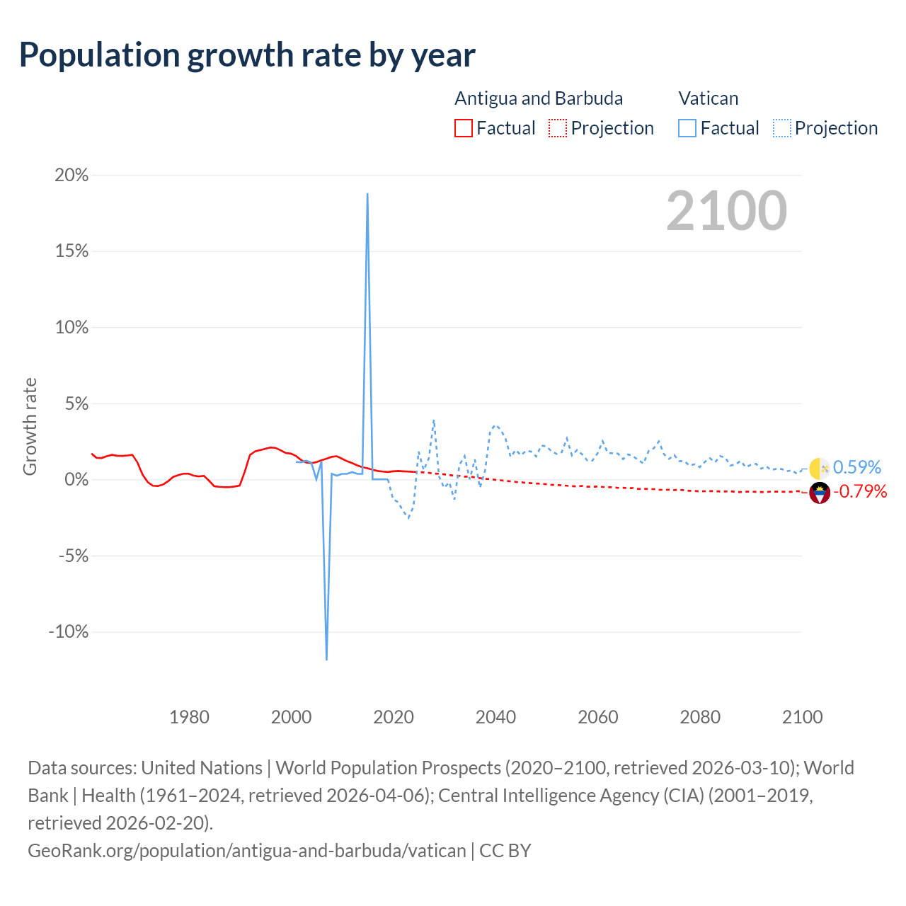 - For the last 10 years, Antigua and Barbuda has had an average growth rate of +0.57% per year vs +1.9% in the Vatican.