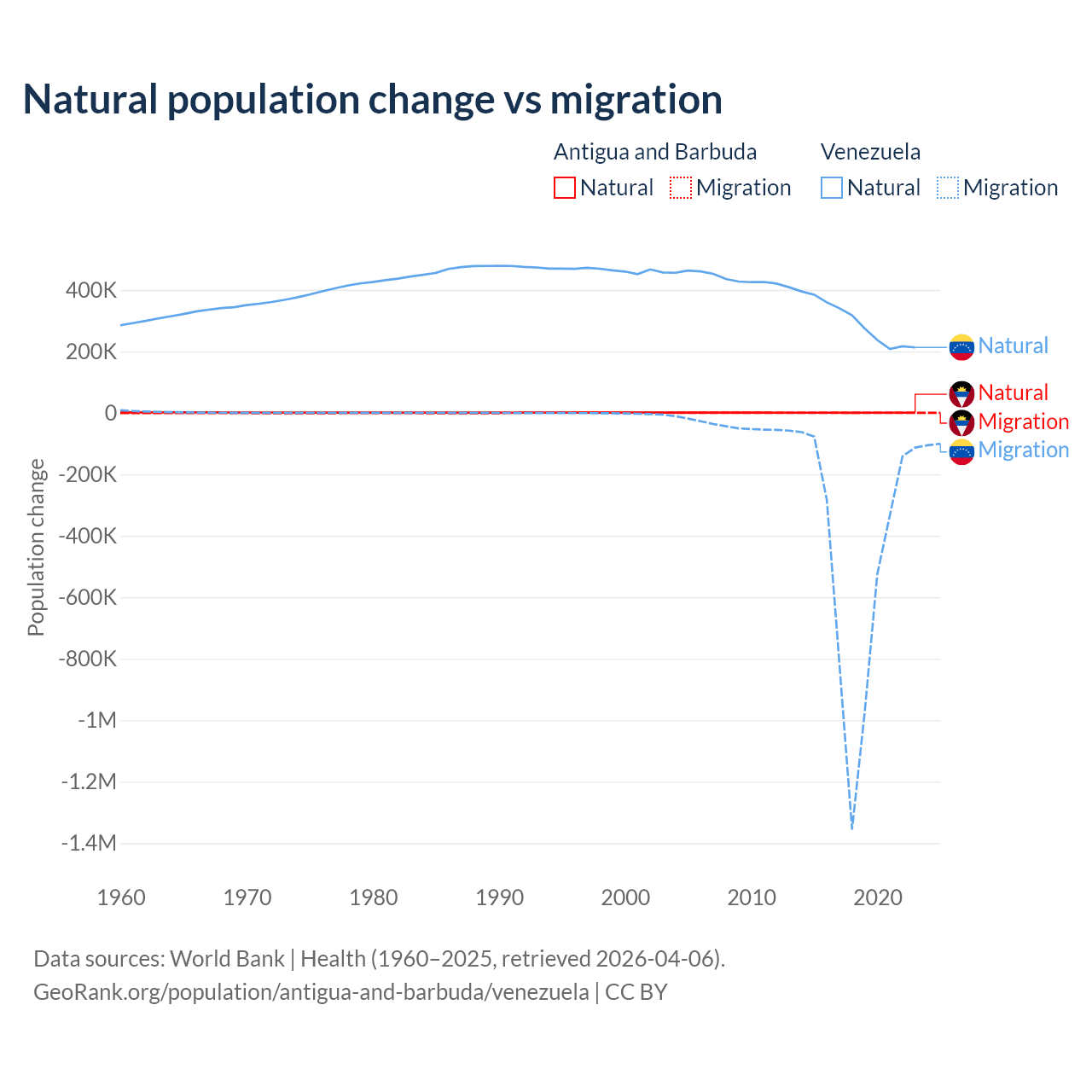 Over the last 10 years, 97.2% of the population change in Antigua and Barbuda is from natural causes (a gain of 4,971 people) and 2.76% is from migration (a gain of 141 people). In Venezuela 38.6% is from natural causes (a gain of 2,946,257 people) and 61.4% is from migration (a loss of 4,683,227 people).