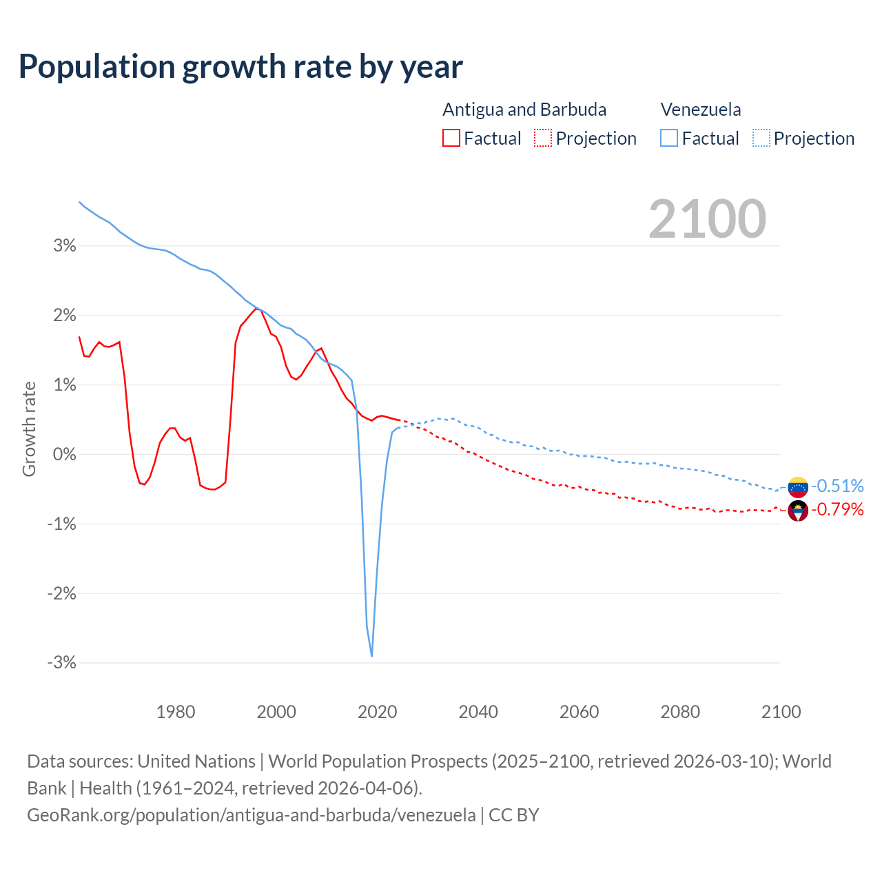 - For the last 10 years, Antigua and Barbuda has had an average growth rate of +0.57% per year vs -0.46% in Venezuela.