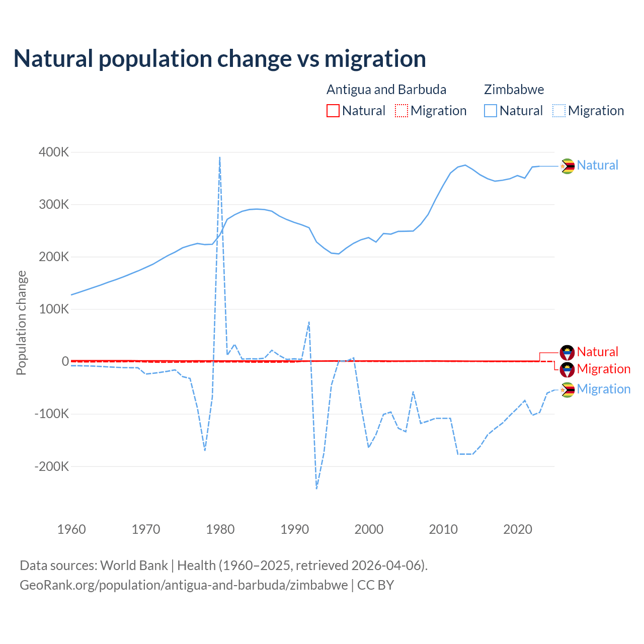 Over the last 10 years, 97.2% of the population change in Antigua and Barbuda is from natural causes (a gain of 4,971 people) and 2.76% is from migration (a gain of 141 people). In Zimbabwe 74.9% is from natural causes (a gain of 3,558,487 people) and 25.1% is from migration (a loss of 1,192,807 people).
