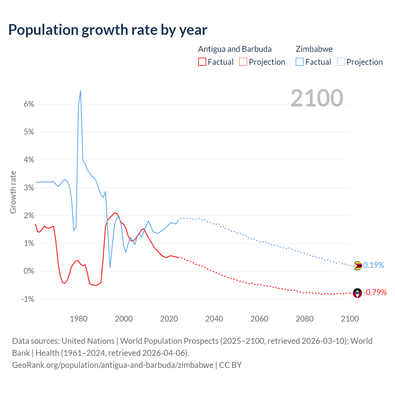 - For the last 10 years, Antigua and Barbuda has had an average growth rate of +0.57% per year vs +1.57% in Zimbabwe.