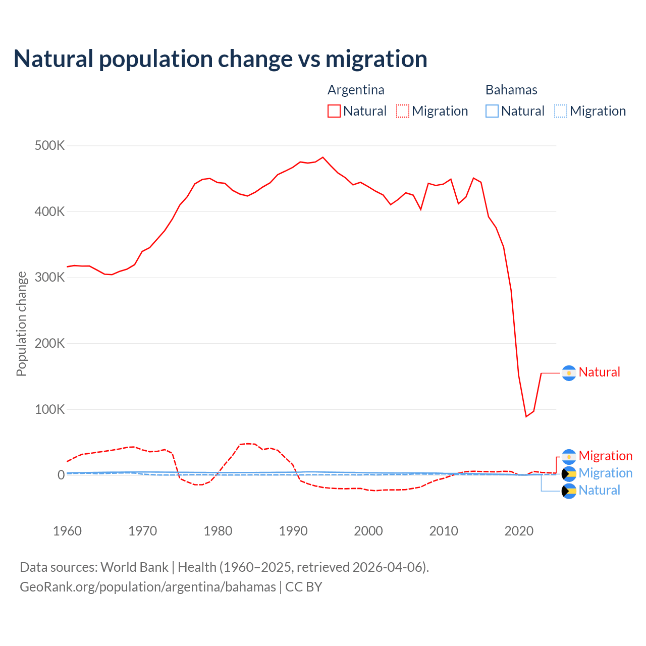 Over the last 10 years, 98.5% of the population change in Argentina is from natural causes (a gain of 2,779,031 people) and 1.52% is from migration (a gain of 42,871 people). In the Bahamas 56.9% is from natural causes (a gain of 11,209 people) and 43.1% is from migration (a gain of 8,495 people).