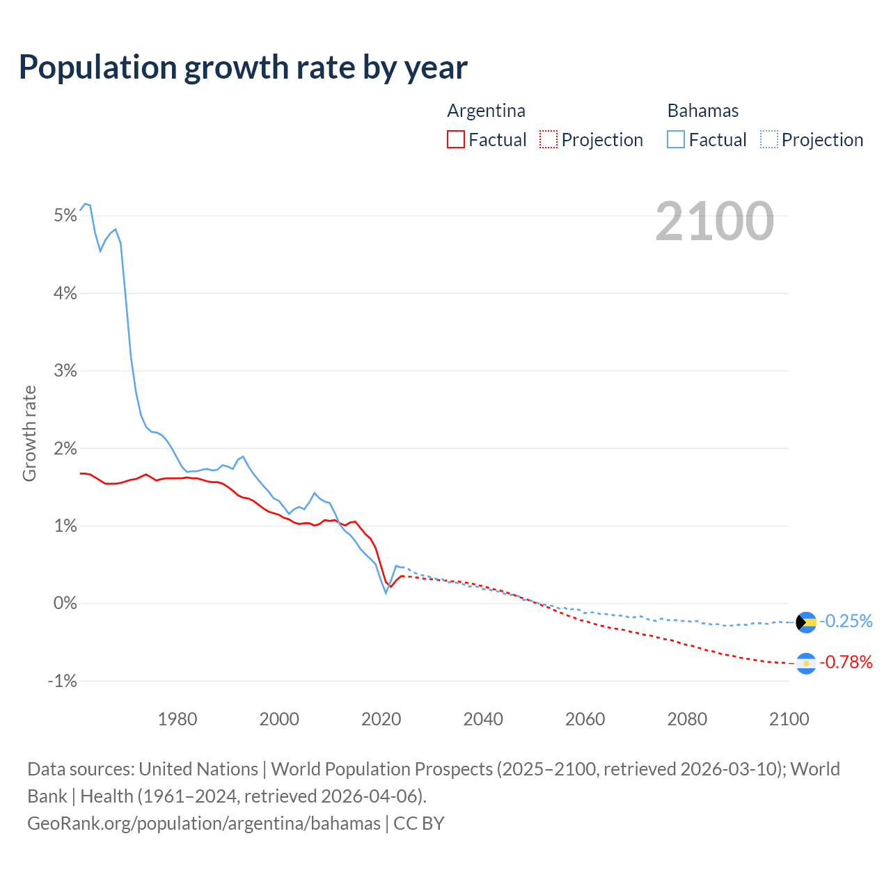 - For the last 10 years, Argentina has had an average growth rate of +0.64% per year vs +0.52% in the Bahamas.