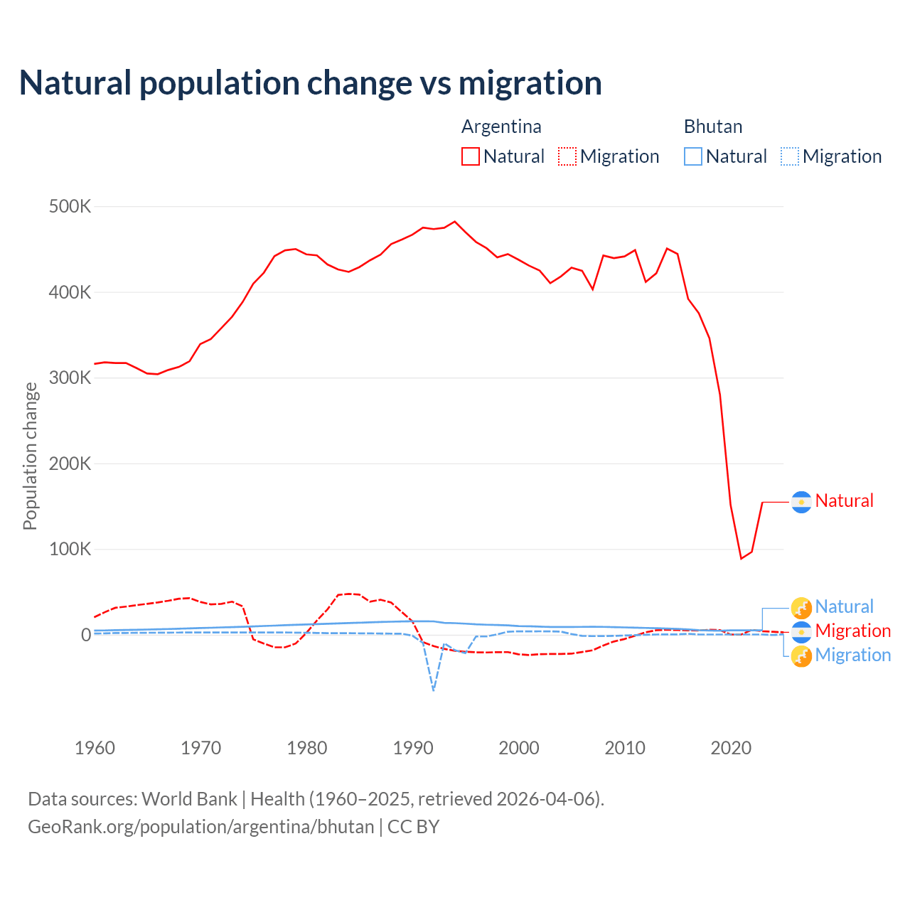 Over the last 10 years, 98.5% of the population change in Argentina is from natural causes (a gain of 2,779,031 people) and 1.52% is from migration (a gain of 42,871 people). In Bhutan 93.3% is from natural causes (a gain of 55,796 people) and 6.74% is from migration (a gain of 4,035 people).