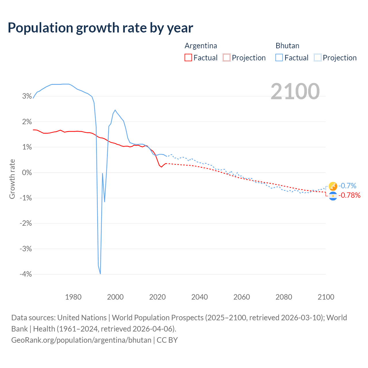 - For the last 10 years, Argentina has had an average growth rate of +0.64% per year vs +0.8% in Bhutan.