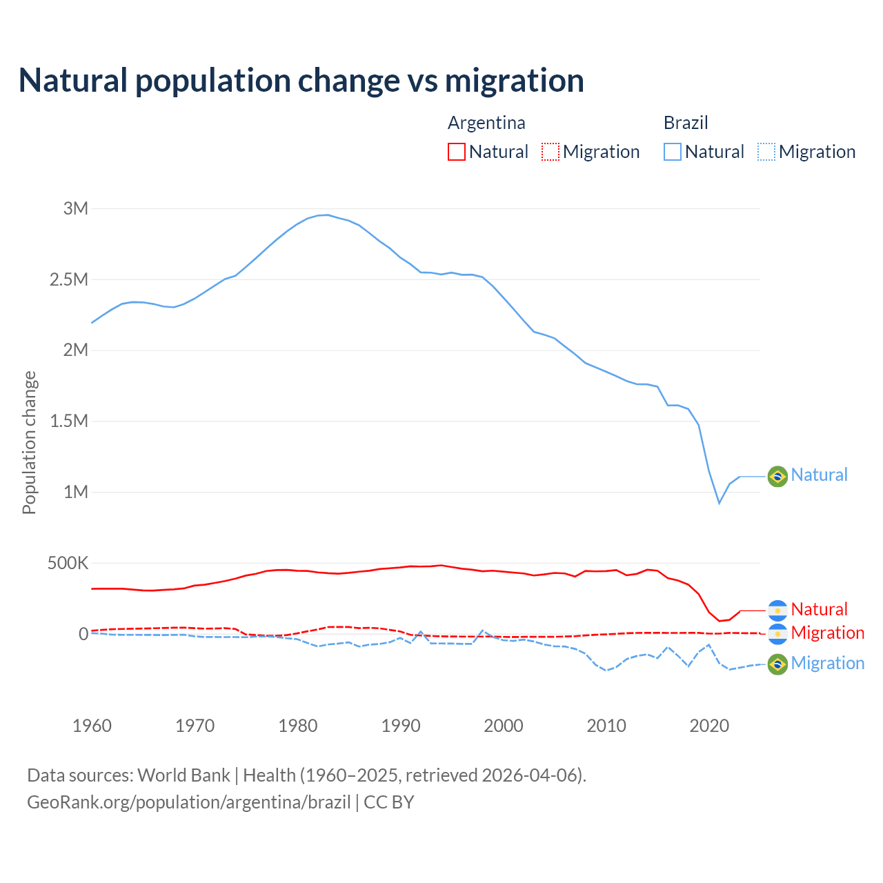 Over the last 10 years, 98.5% of the population change in Argentina is from natural causes (a gain of 2,779,031 people) and 1.52% is from migration (a gain of 42,871 people). In Brazil 89.1% is from natural causes (a gain of 14,004,164 people) and 10.9% is from migration (a loss of 1,708,894 people).