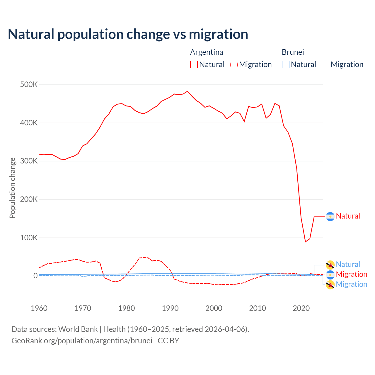 Over the last 10 years, 98.5% of the population change in Argentina is from natural causes (a gain of 2,779,031 people) and 1.52% is from migration (a gain of 42,871 people). In Brunei 93.9% is from natural causes (a gain of 43,993 people) and 6.15% is from migration (a gain of 2,882 people).