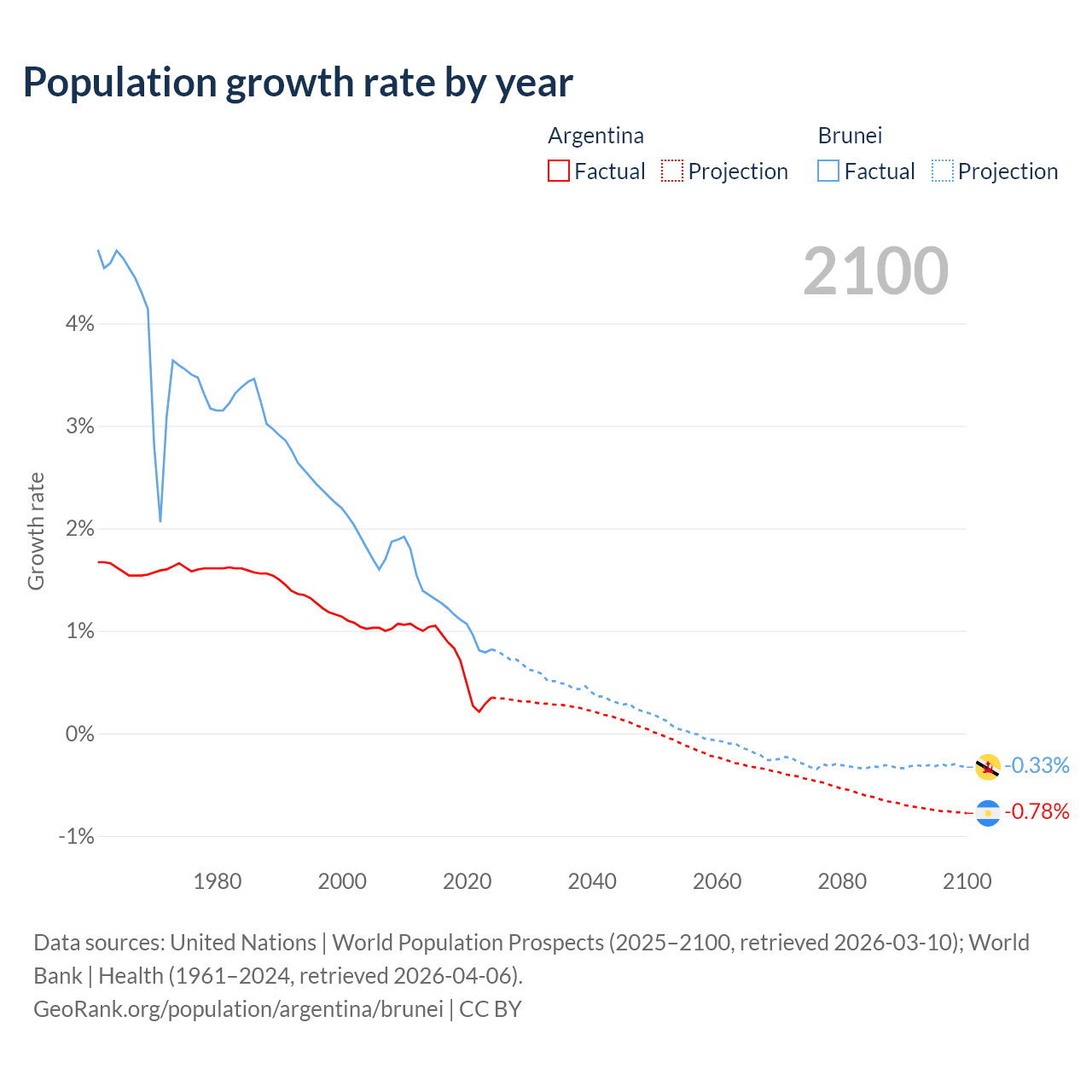 - For the last 10 years, Argentina has had an average growth rate of +0.64% per year vs +1.08% in Brunei.