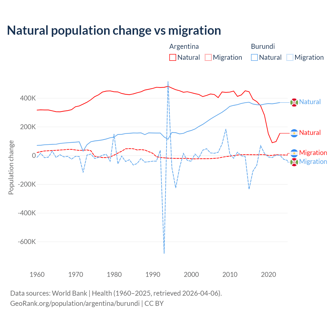 Over the last 10 years, 98.5% of the population change in Argentina is from natural causes (a gain of 2,779,031 people) and 1.52% is from migration (a gain of 42,871 people). In Burundi 91% is from natural causes (a gain of 3,614,502 people) and 9.03% is from migration (a loss of 358,928 people).