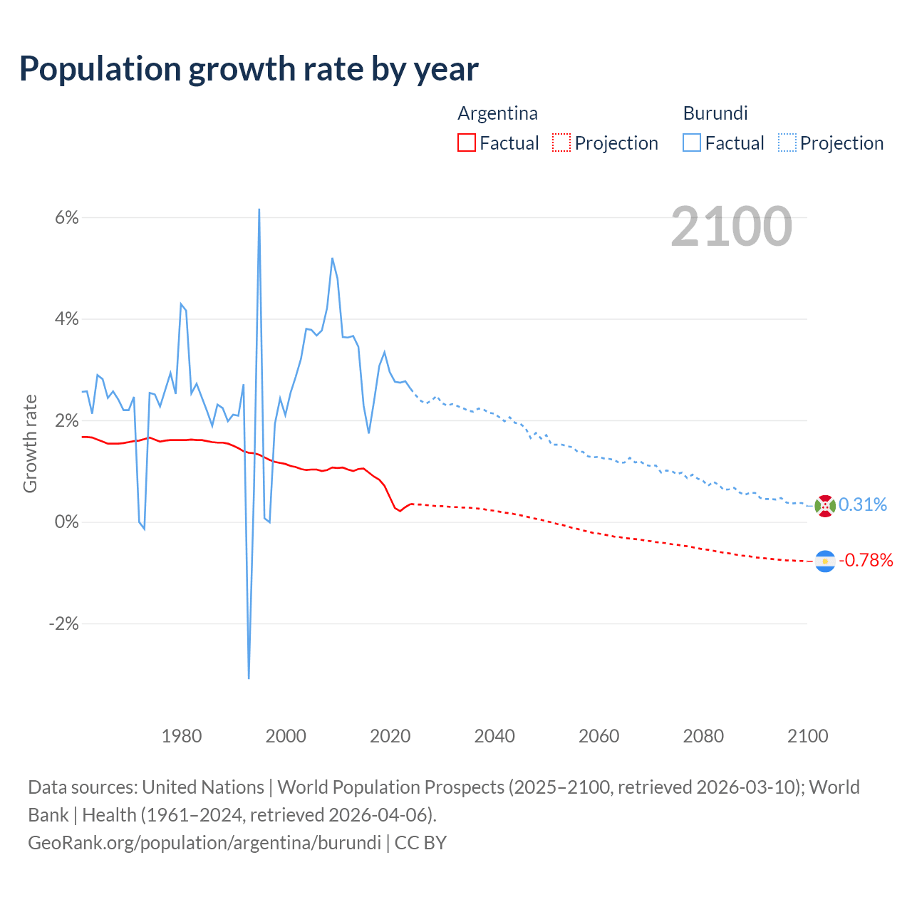 - For the last 10 years, Argentina has had an average growth rate of +0.64% per year vs +2.74% in Burundi.