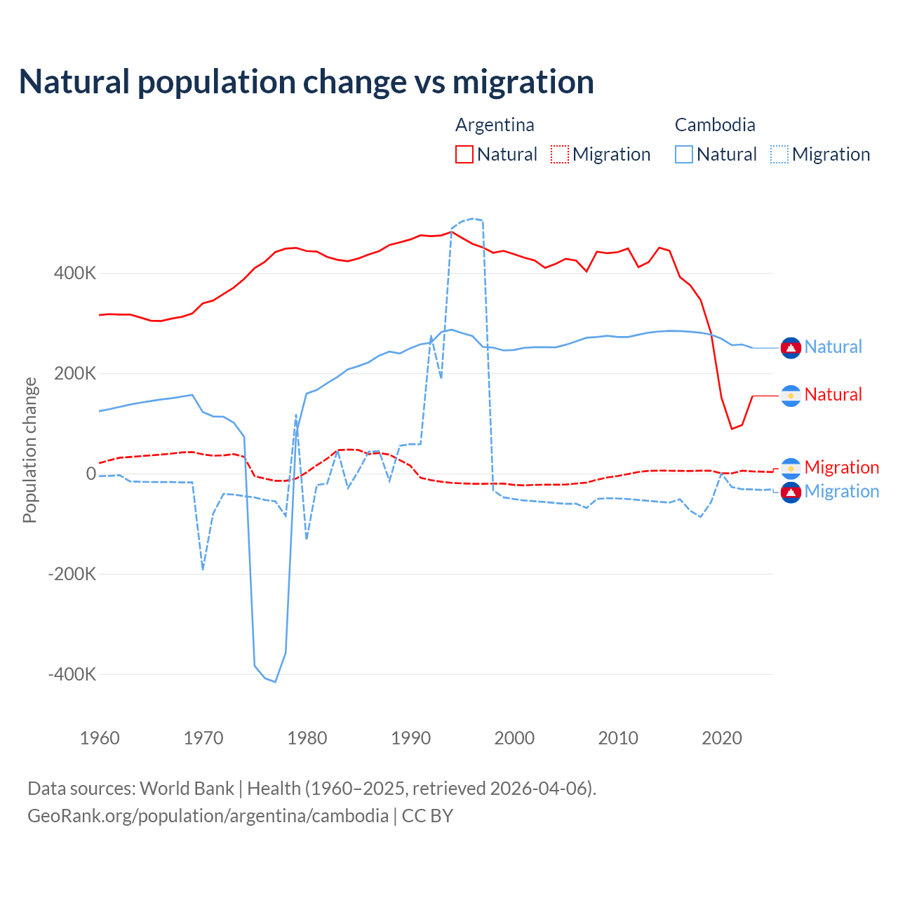 Over the last 10 years, 98.5% of the population change in Argentina is from natural causes (a gain of 2,779,031 people) and 1.52% is from migration (a gain of 42,871 people). In Cambodia 85.2% is from natural causes (a gain of 2,724,147 people) and 14.8% is from migration (a loss of 474,505 people).