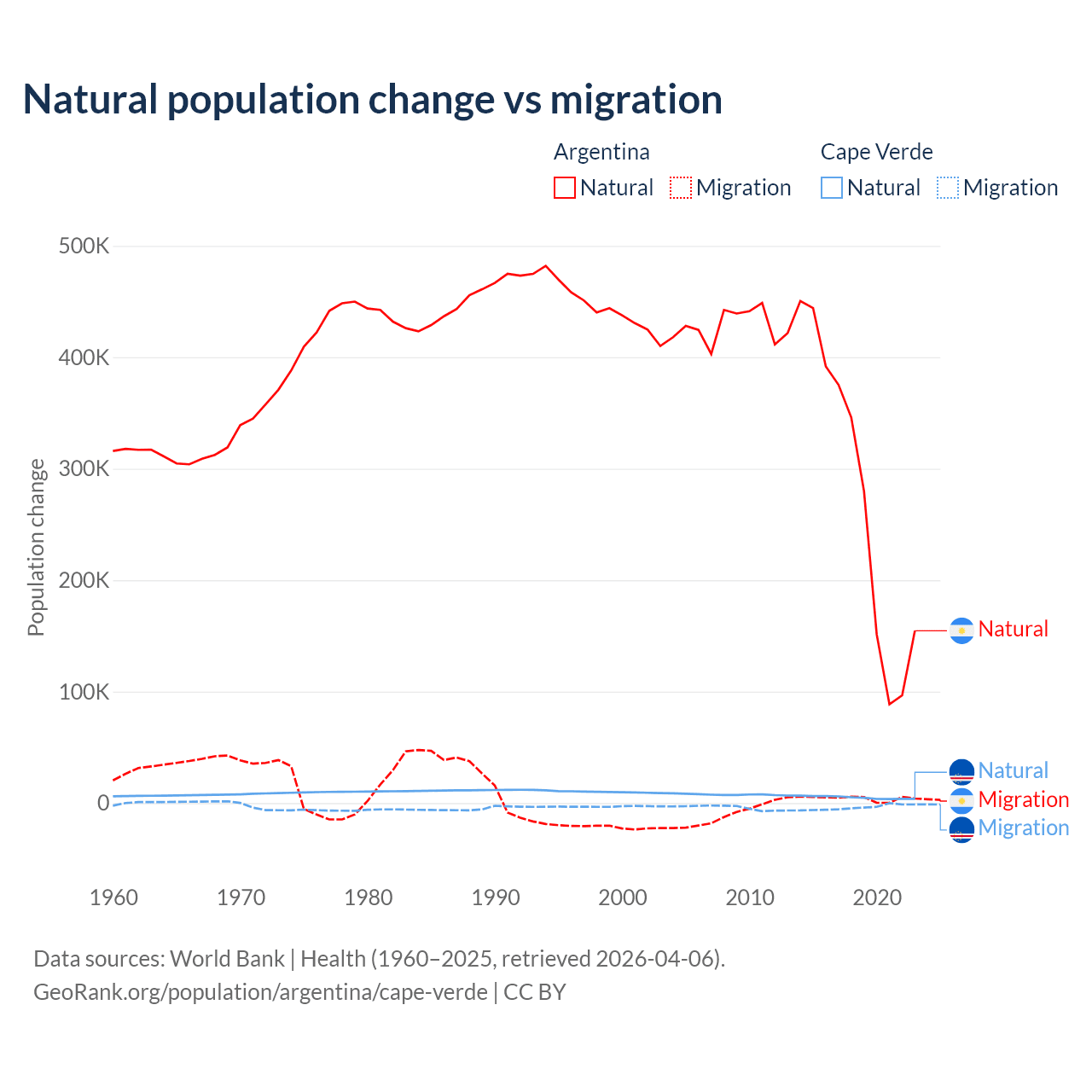 Over the last 10 years, 98.5% of the population change in Argentina is from natural causes (a gain of 2,779,031 people) and 1.52% is from migration (a gain of 42,871 people). In Cape Verde 56.4% is from natural causes (a gain of 50,193 people) and 43.6% is from migration (a loss of 38,879 people).