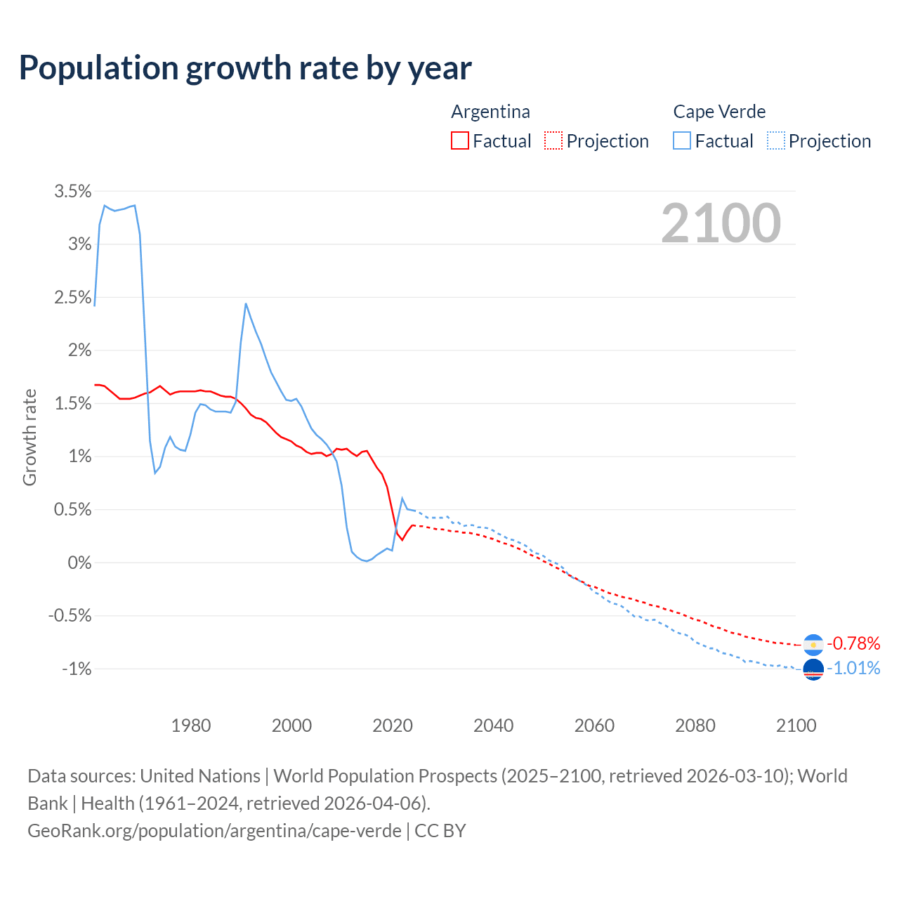 - For the last 10 years, Argentina has had an average growth rate of +0.64% per year vs +0.22% in Cape Verde.