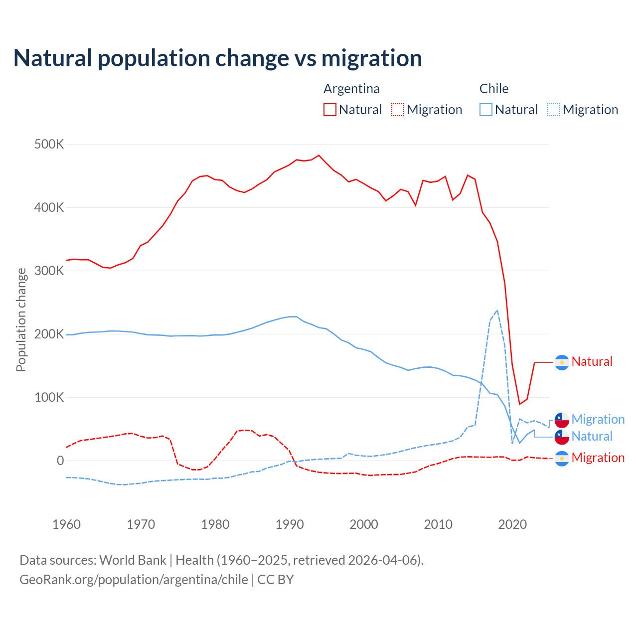 Over the last 10 years, 98.5% of the population change in Argentina is from natural causes (a gain of 2,779,031 people) and 1.52% is from migration (a gain of 42,871 people). In Chile 43.5% is from natural causes (a gain of 844,683 people) and 56.5% is from migration (a gain of 1,097,597 people).