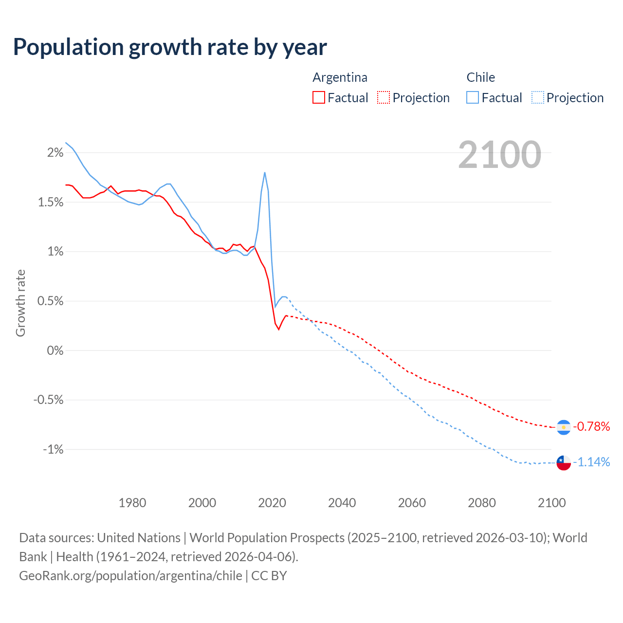 - For the last 10 years, Argentina has had an average growth rate of +0.64% per year vs +1.02% in Chile.