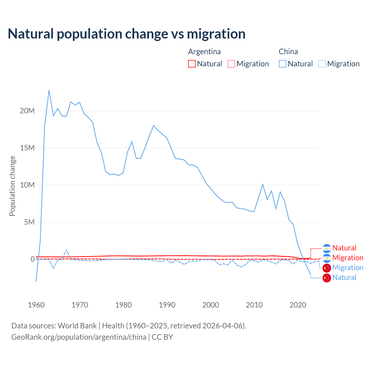 Over the last 10 years, 98.5% of the population change in Argentina is from natural causes (a gain of 2,779,031 people) and 1.52% is from migration (a gain of 42,871 people). In China 92.5% is from natural causes (a gain of 42,414,528 people) and 7.53% is from migration (a loss of 3,452,923 people).