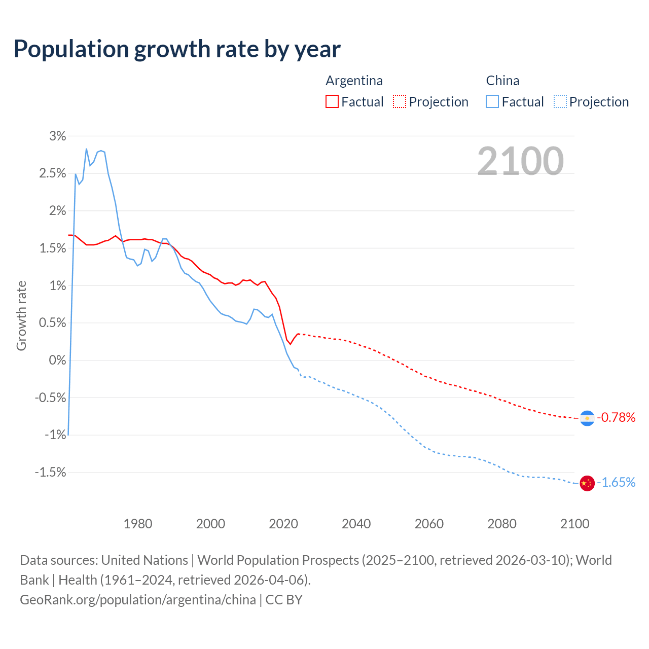 - For the last 10 years, Argentina has had an average growth rate of +0.64% per year vs +0.3% in China.