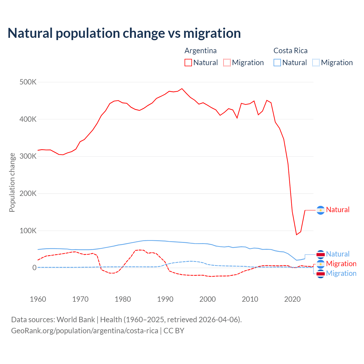 Over the last 10 years, 98.5% of the population change in Argentina is from natural causes (a gain of 2,779,031 people) and 1.52% is from migration (a gain of 42,871 people). In Costa Rica 96.3% is from natural causes (a gain of 362,624 people) and 3.69% is from migration (a gain of 13,900 people).