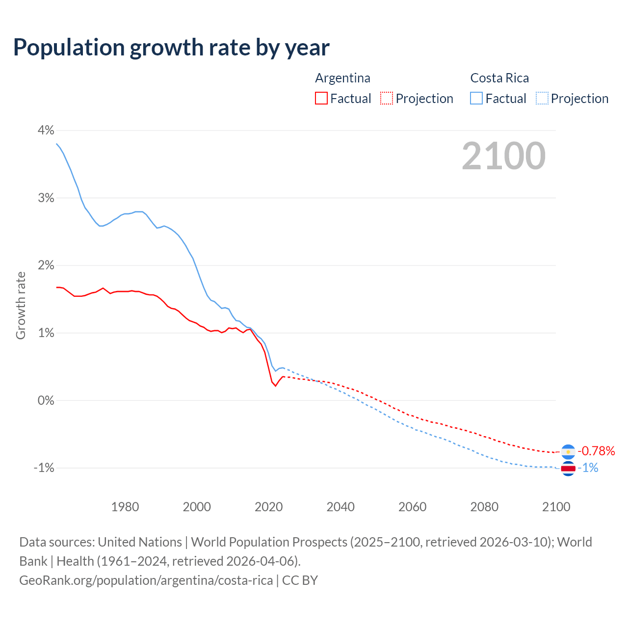 - For the last 10 years, Argentina has had an average growth rate of +0.64% per year vs +0.77% in Costa Rica.