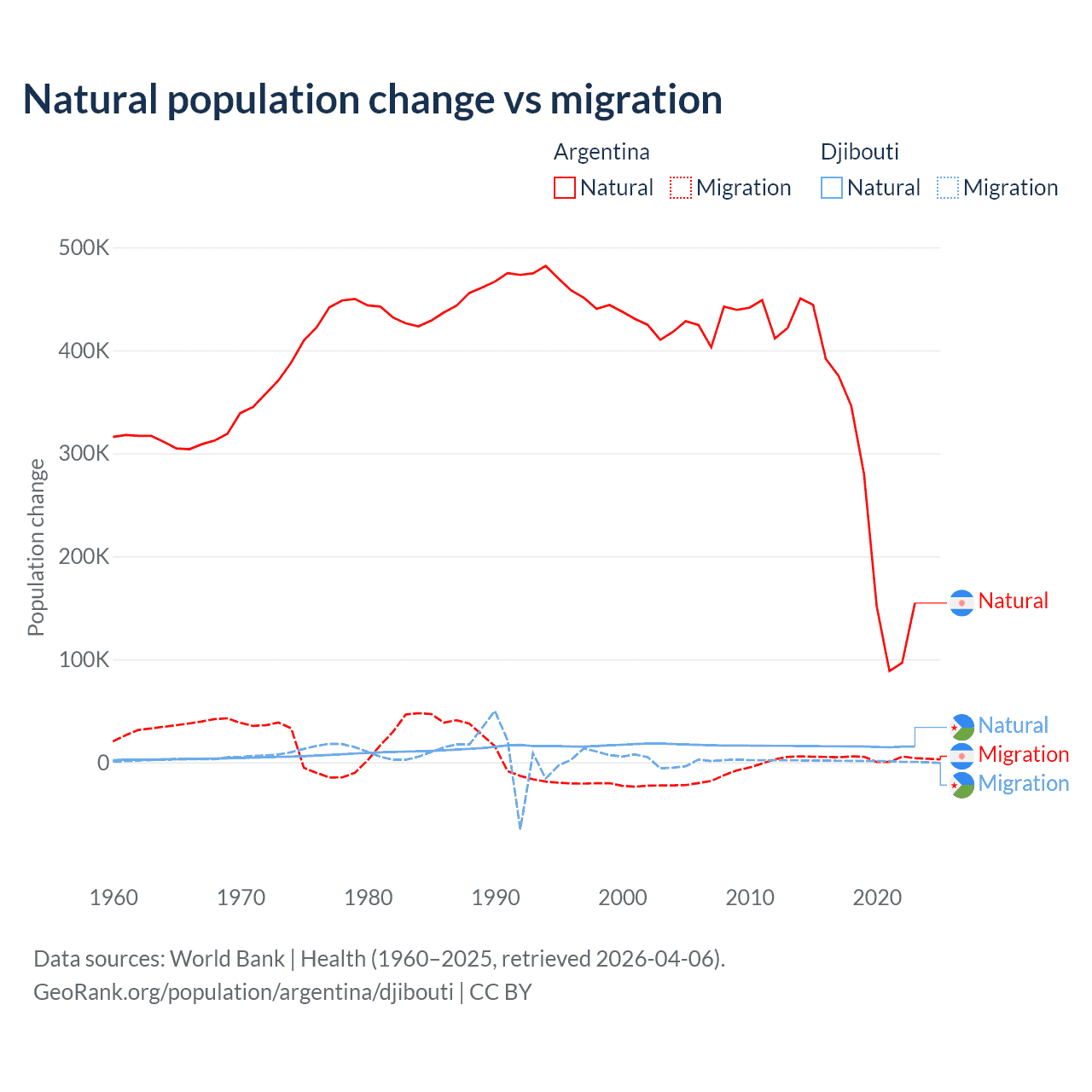Over the last 10 years, 98.5% of the population change in Argentina is from natural causes (a gain of 2,779,031 people) and 1.52% is from migration (a gain of 42,871 people). In Djibouti 92.1% is from natural causes (a gain of 153,892 people) and 7.87% is from migration (a gain of 13,138 people).