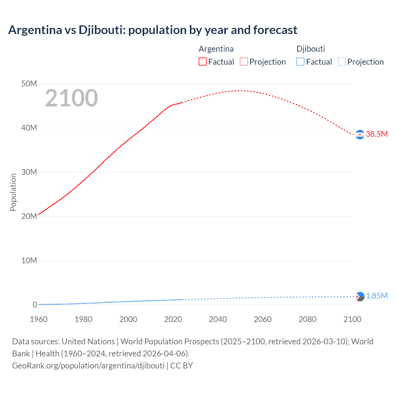 The latest officially reported population of Argentina was 45,696,159 in 2024 vs 1,168,722 people in Djibouti in 2024. In 2026, based on the adjusted UN estimation, the current Argentina's population is 46,048,053 people compared to 1,203,929 in Djibouti.