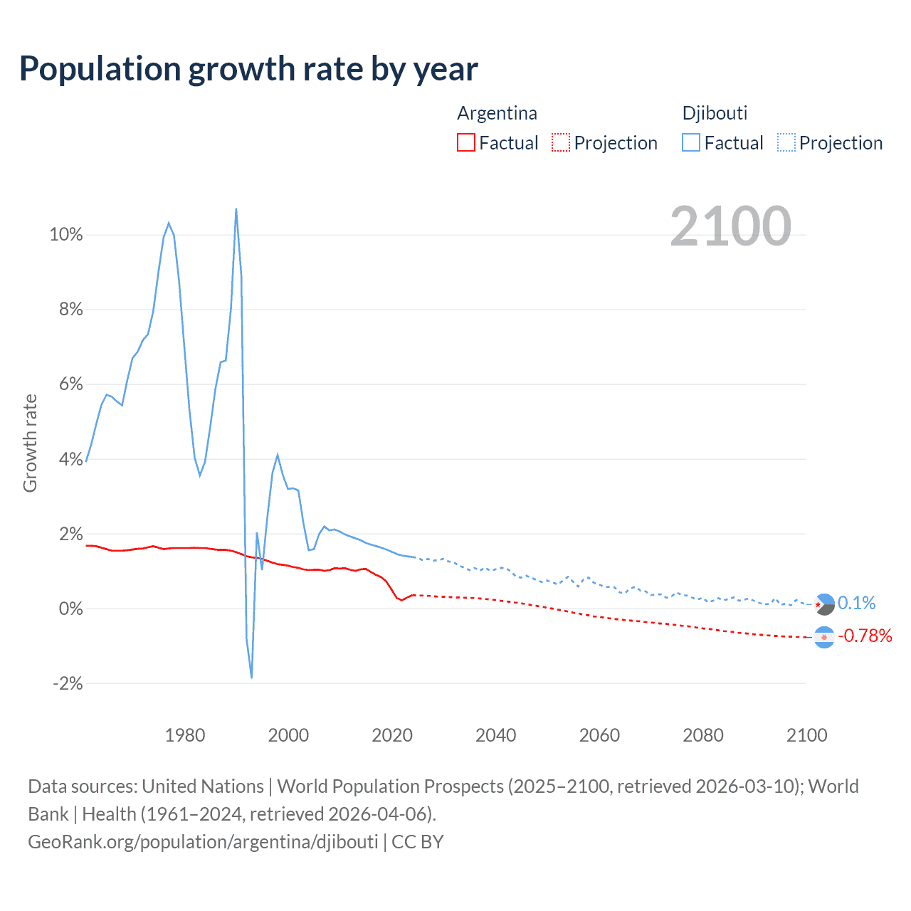 - For the last 10 years, Argentina has had an average growth rate of +0.64% per year vs +1.57% in Djibouti.