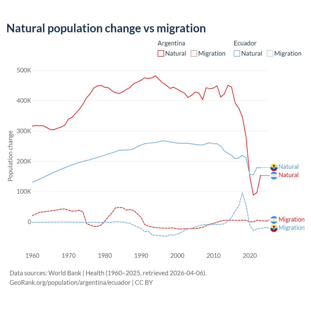 Over the last 10 years, 98.5% of the population change in Argentina is from natural causes (a gain of 2,779,031 people) and 1.52% is from migration (a gain of 42,871 people). In Ecuador 91.9% is from natural causes (a gain of 1,964,352 people) and 8.08% is from migration (a gain of 172,707 people).