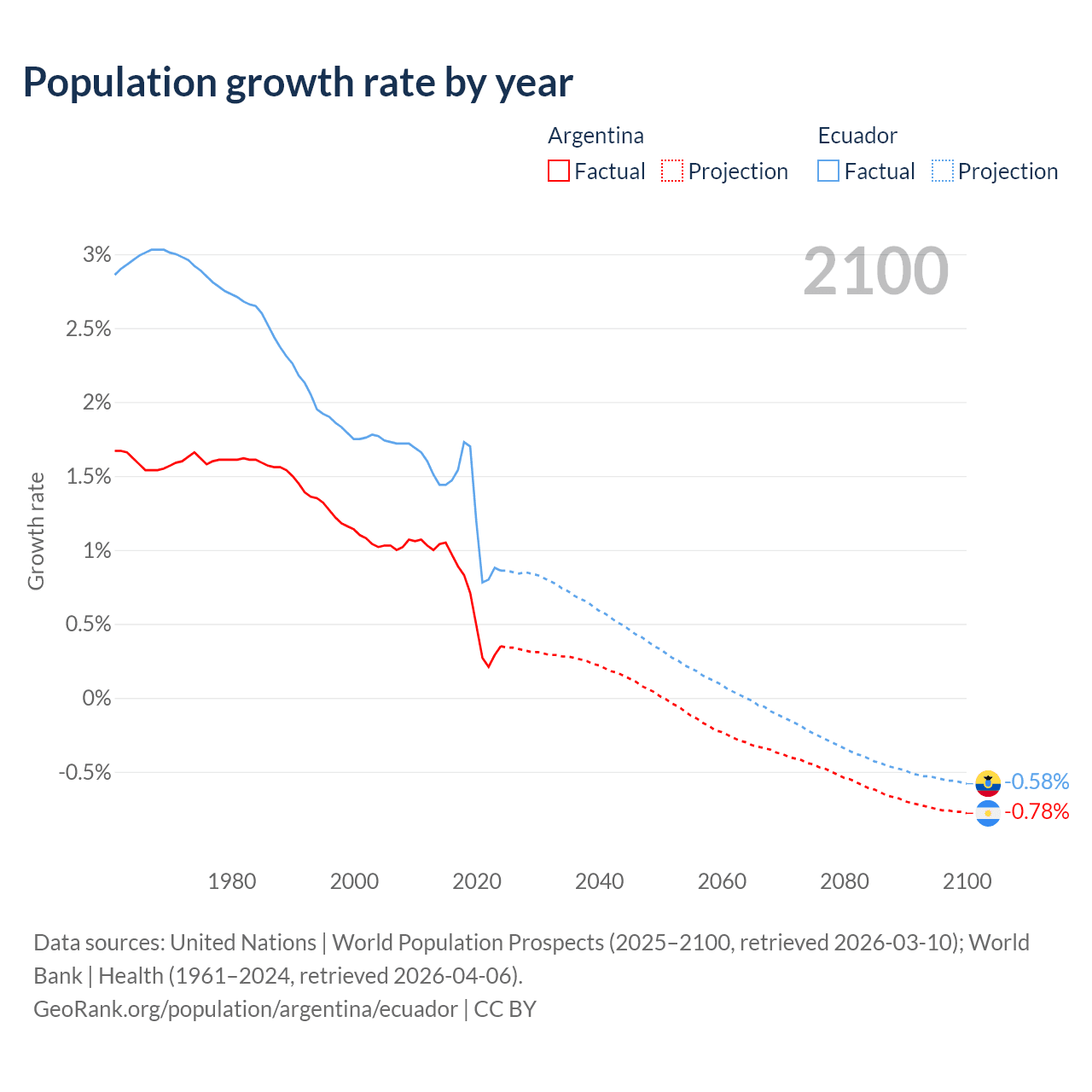 Data sources: World Bank | Health (1960–2024, retrieved 2026-04-06); United Nations | World Population Prospects (1960–2026, retrieved 2026-03-10); U.S. Census Bureau (1960–2025, retrieved 2026-02-08); Central Intelligence Agency (CIA) (2000–2019, retrieved 2026-02-20).