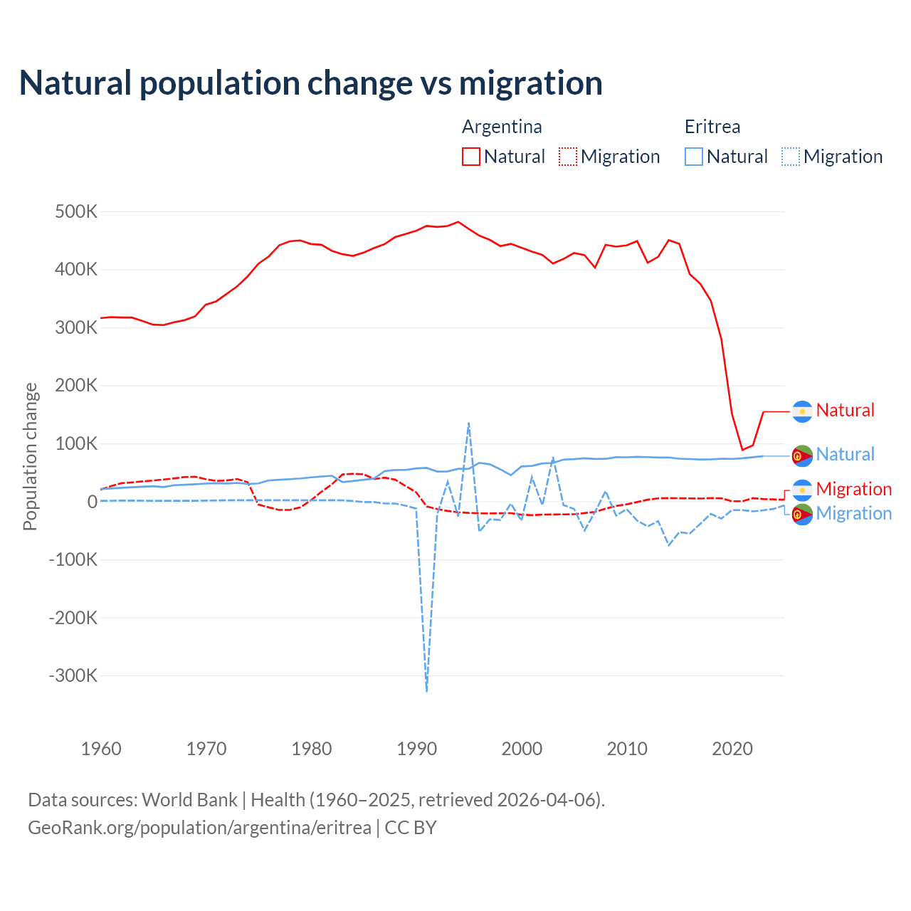 Over the last 10 years, 98.5% of the population change in Argentina is from natural causes (a gain of 2,779,031 people) and 1.52% is from migration (a gain of 42,871 people). In Eritrea 68.8% is from natural causes (a gain of 742,837 people) and 31.2% is from migration (a loss of 336,243 people).