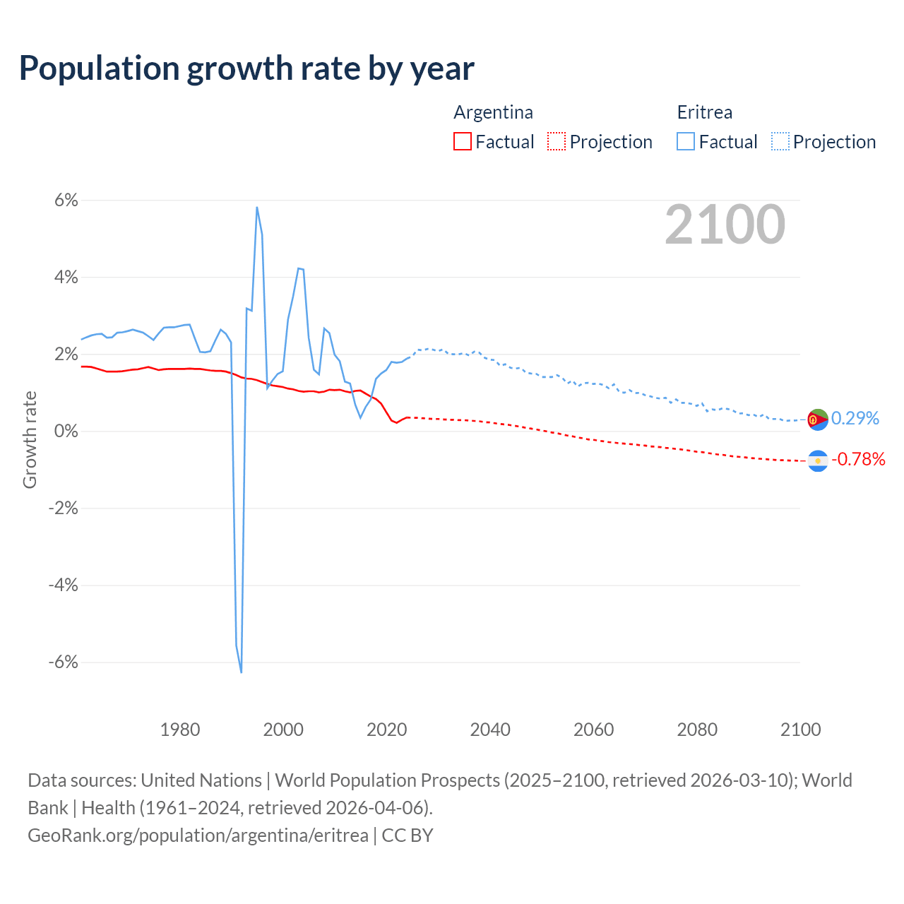 - For the last 10 years, Argentina has had an average growth rate of +0.64% per year vs +1.28% in Eritrea.