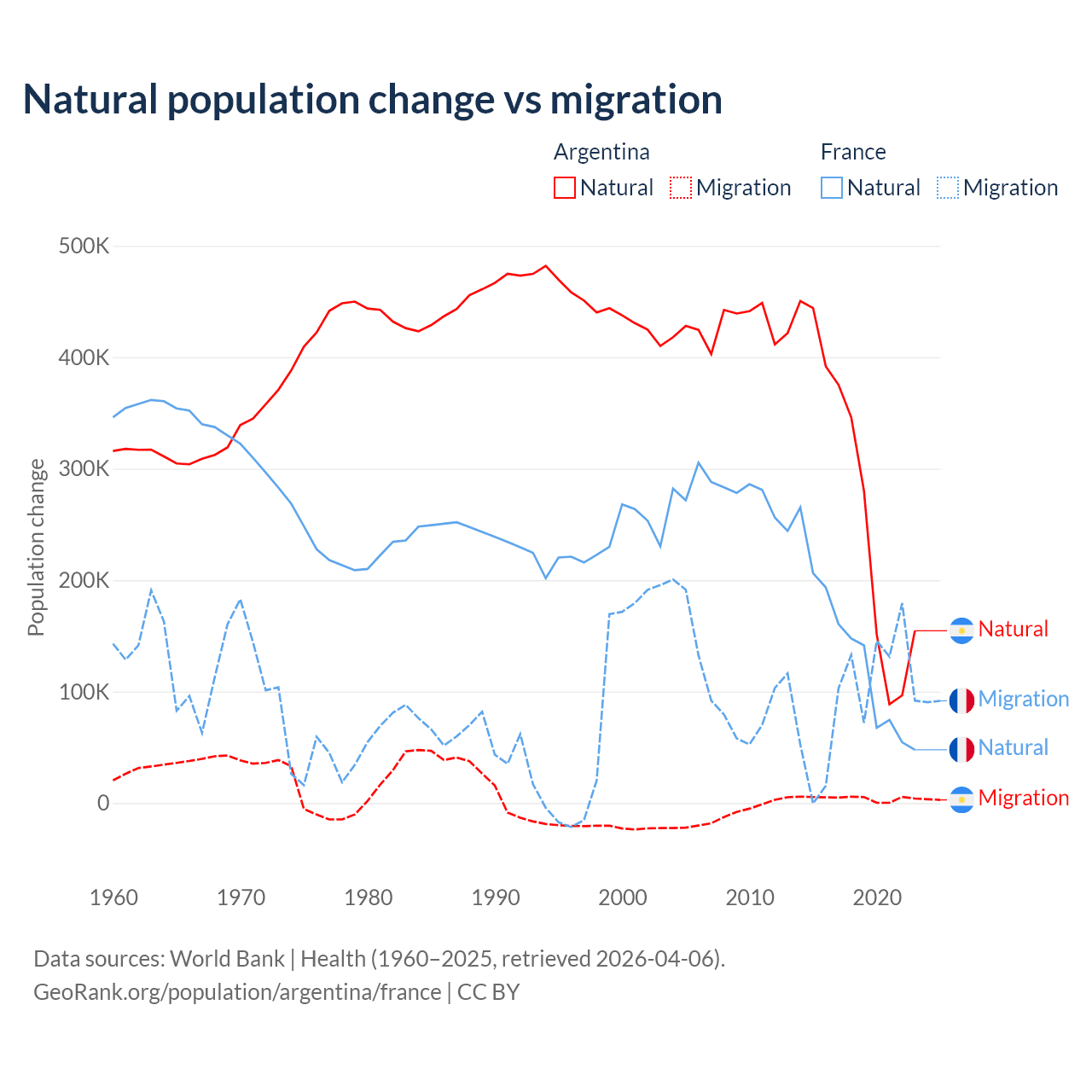 Over the last 10 years, 98.5% of the population change in Argentina is from natural causes (a gain of 2,779,031 people) and 1.52% is from migration (a gain of 42,871 people). In France 59.5% is from natural causes (a gain of 1,359,540 people) and 40.5% is from migration (a gain of 923,723 people).