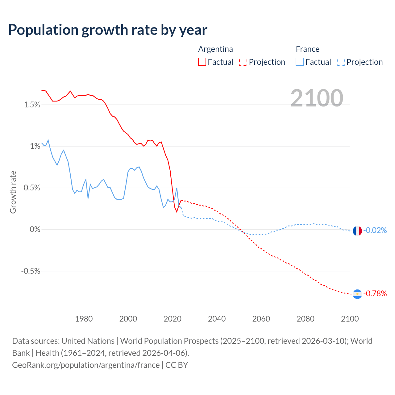- For the last 10 years, Argentina has had an average growth rate of +0.64% per year vs +0.35% in France.