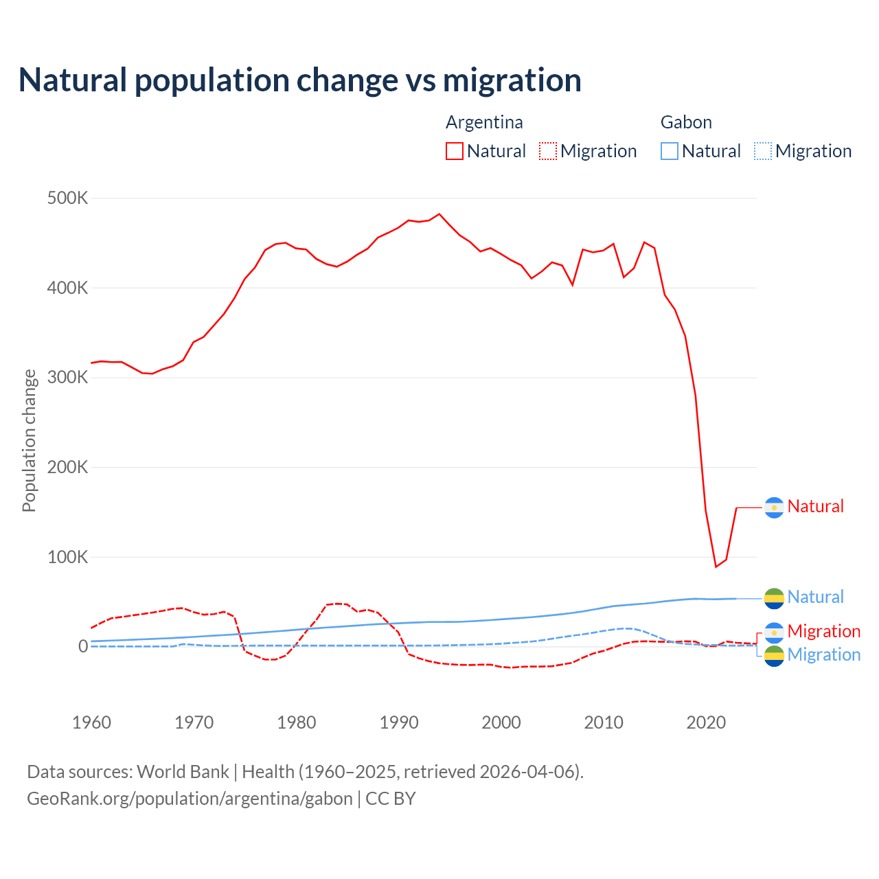 Over the last 10 years, 98.5% of the population change in Argentina is from natural causes (a gain of 2,779,031 people) and 1.52% is from migration (a gain of 42,871 people). In Gabon 91.1% is from natural causes (a gain of 515,484 people) and 8.86% is from migration (a gain of 50,119 people).