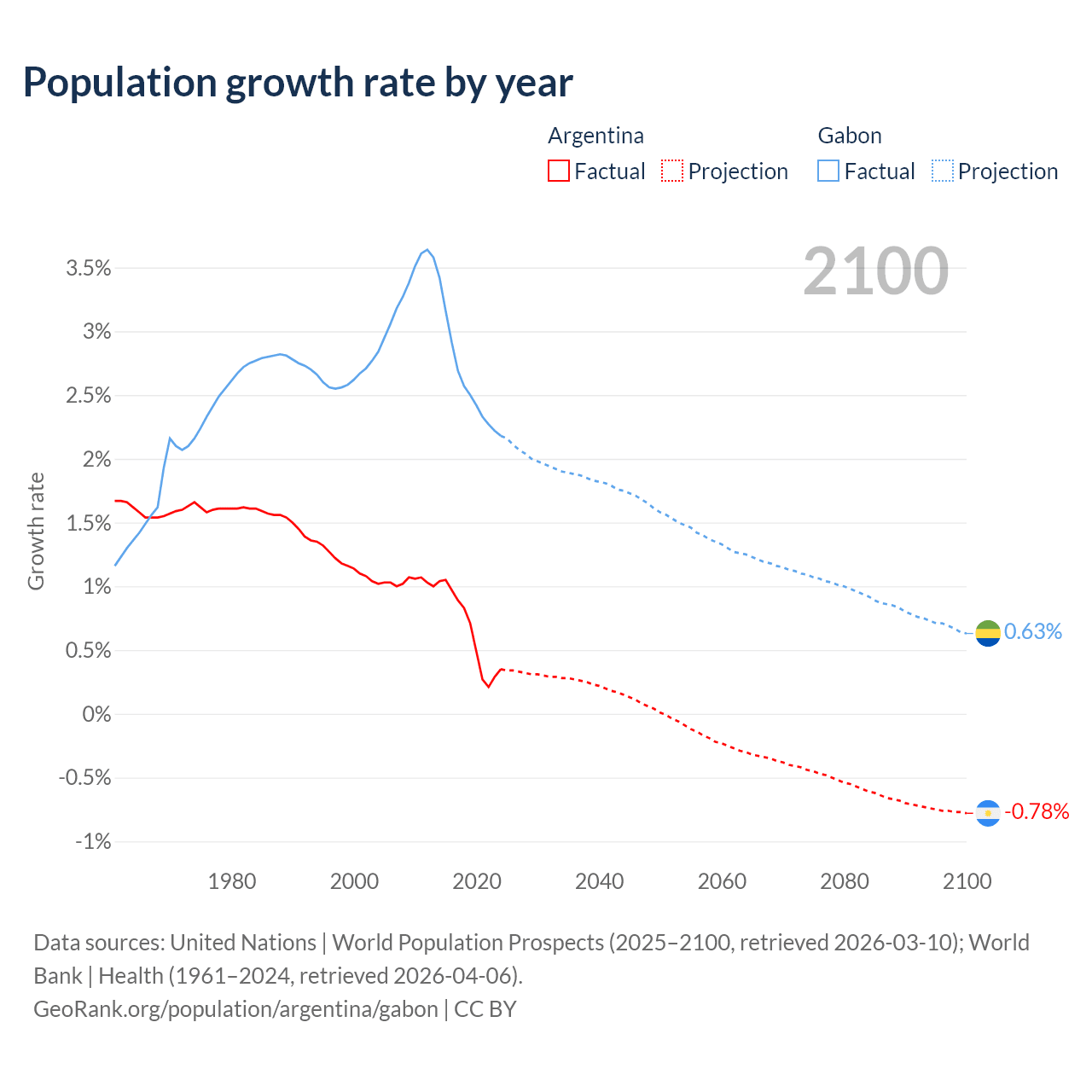 - For the last 10 years, Argentina has had an average growth rate of +0.64% per year vs +2.61% in Gabon.