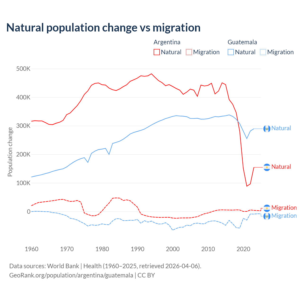 Over the last 10 years, 98.5% of the population change in Argentina is from natural causes (a gain of 2,779,031 people) and 1.52% is from migration (a gain of 42,871 people). In Guatemala 89.8% is from natural causes (a gain of 3,077,847 people) and 10.2% is from migration (a loss of 347,818 people).