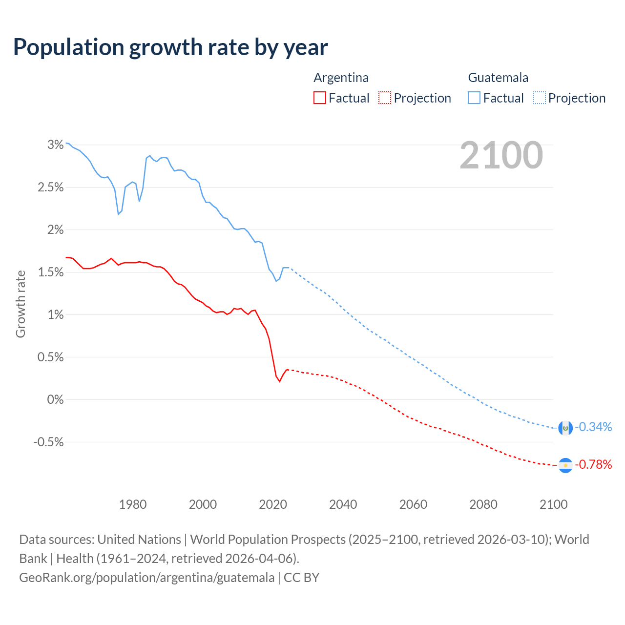 - For the last 10 years, Argentina has had an average growth rate of +0.64% per year vs +1.64% in Guatemala.